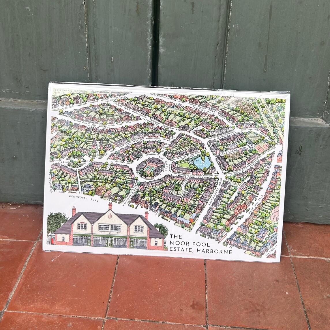Illustrated print of Moor Pool Estate, drawn by local artist E L Thrush.