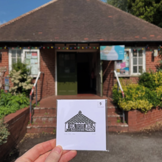 Mini linoprint of Moor Pool Hall, made by local maker nothing or something.